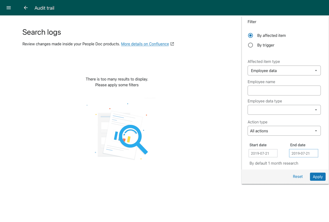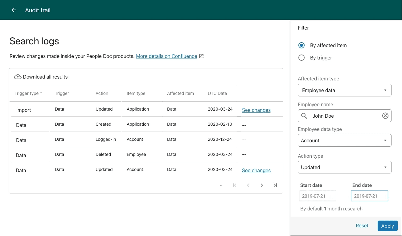 Affected item → Employee name/ID → Date range → Action typeAdded "All actions" optionDual entry for employees (by name or UUID)